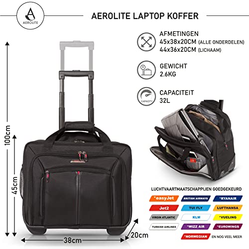 Aerolite 15.6” Gevoerde Laptop Rolkoffer Cabine Handbagage Zakelijke Tas – Goedgekeurd voor Ryanair, Easyjet, BA & KLM, 2 Jaar Garantie, (Zwart)