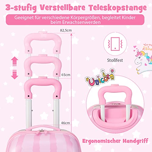 COSTWAY 2-delige kinderkoffer + rugzak, kindertrolley van kunststof, kinderbagage, kinderkofferset, handbagage, reisbagage, harde koffer voor jongens en meisjes, roze eenhoorns, 12″+16″, kinderkoffer